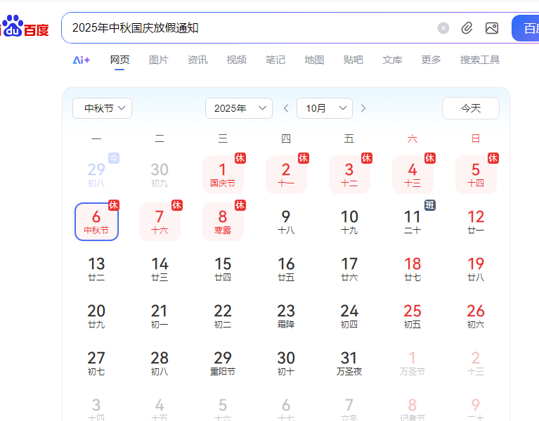 調休時間:9 月 28 日(周日)、10 月 11 日(周六)正常上班。